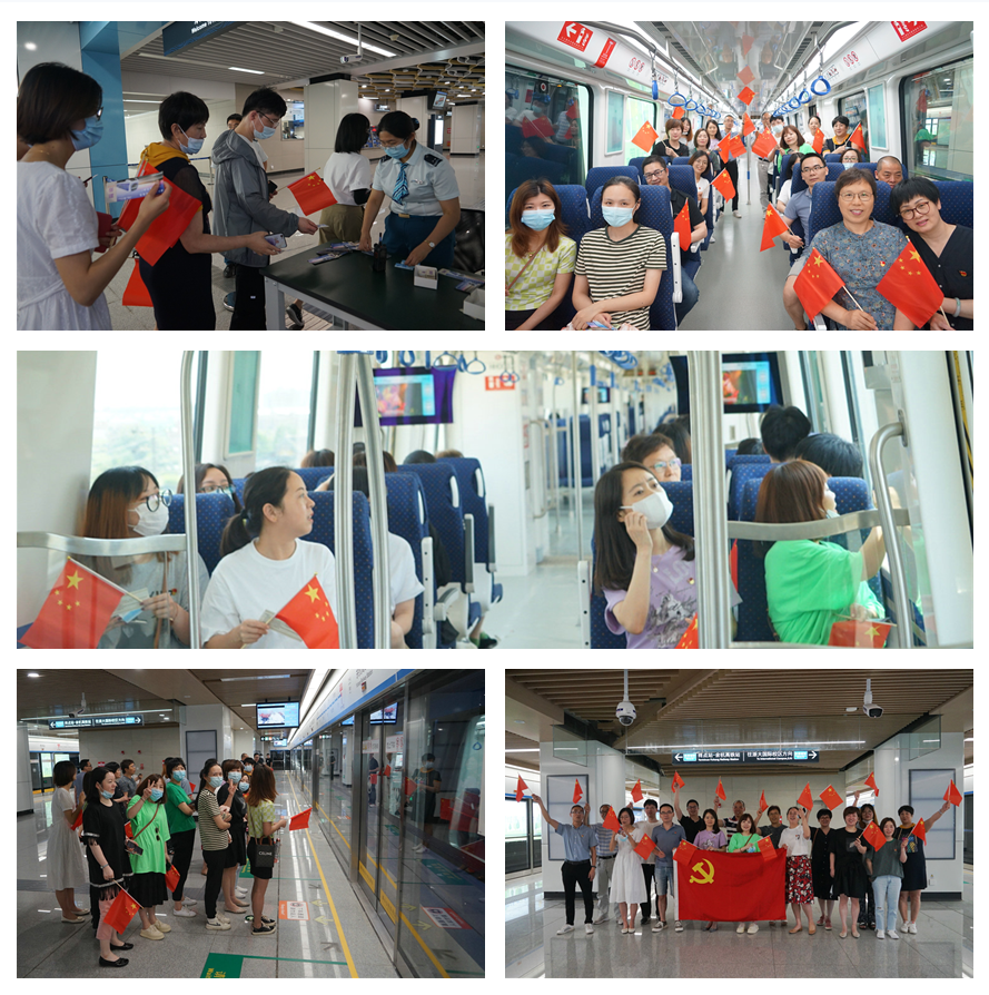 下午1:20,黨員職工們在大廈底樓集合,一起興高采烈出發至皮革城站入口,換票、安檢、檢票進站后,踏上了杭海城際鐵路的試乘旅途。大家手舉小紅旗,激動之情溢于言表。
